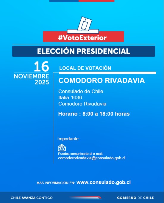 En la Argentina —donde reside una comunidad chilena numerosa, especialmente en la Patagonia— el voto se podrá ejercer únicamente en los consulados habilitados. En el caso de Comodoro Rivadavia, la jornada se desarrollará en: