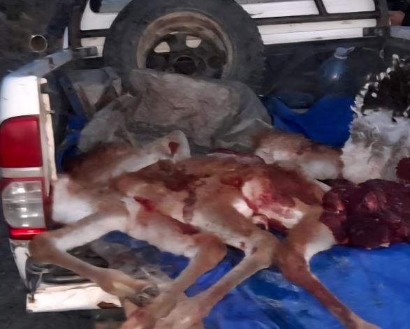 En ese contexto, los efectivos detuvieron la marcha de una camioneta Toyota Hilux y, al inspeccionar la caja del vehículo, observaron cuatro cuartos, cuatro paletas y cuatro lomos despostados de guanaco (Lama guanicoe), además de un ñandú patagónico, especie considerada protegida.
