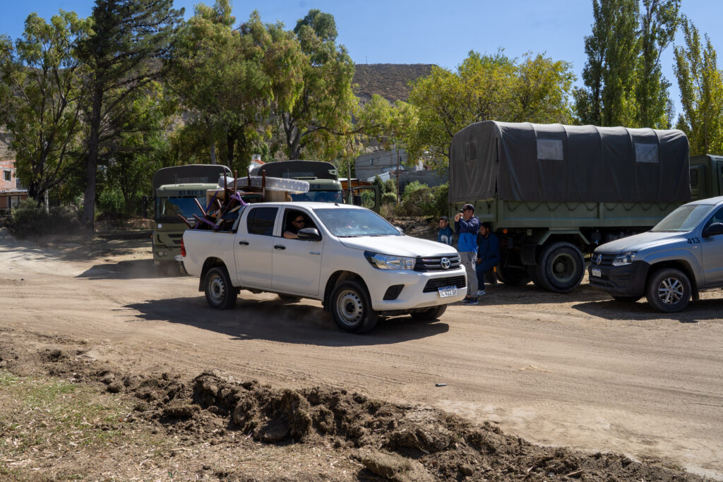 En ese sentido, Gómez precisó que “a media mañana se determinó que el suelo no soportaría el peso de los camiones del Ejército, que alcanzan los 20.000 kilogramos, por lo que se resolvió trabajar con 35 camionetas, permitiendo así una operatoria más liviana y segura y ordenada”. En este marco, comenzó el operativo con camionetas Municipales, gremios y empresas petroleras.